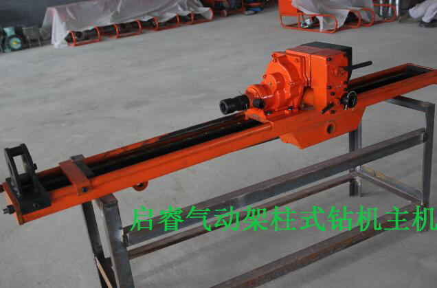 氣動探水鉆機(jī)是架柱式型的,型號為ZQJC系列,按照扭矩從220N.m到1000N.m,型號有十多個(gè),氣動架柱式鉆機(jī)有幾個(gè)特點(diǎn):全氣動,直接接坑道內(nèi)高壓空氣,不用電,隨時(shí)使用;該鉆機(jī)轉(zhuǎn)矩大、轉(zhuǎn)速高,比如啟睿ZQJC-380/7.3s氣動架柱式鉆機(jī),轉(zhuǎn)矩380N.m,轉(zhuǎn)速185r/min,這是扭矩較小的氣動架柱式鉆機(jī),該系列鉆機(jī)扭矩可達(dá)1000N.m,輸出功率達(dá)11.00KW;氣動架柱式顯著特征是輕便,由于鉆機(jī)是風(fēng)動的,整體結(jié)構(gòu)簡單,加上啟睿鉆機(jī)緊湊性設(shè)計(jì),整機(jī)僅200kg,而且是分體、組裝簡單,對于工作面廣、鉆機(jī)需要經(jīng)常移動的煤礦再適合不過了。