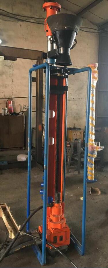 啟睿這款立式煤礦架柱式鉆機(jī)就是之前給陜西一家打頂板的客戶定制的,架柱和頂端都做了調(diào)整。常規(guī)架柱式用來(lái)直接鉆孔的回轉(zhuǎn)動(dòng)力總成安裝在滑軌上,滑軌總成安裝在立柱上,滑軌在立柱上可以旋轉(zhuǎn)。固定鉆機(jī),又能實(shí)現(xiàn)鉆機(jī)各角度全方位鉆孔。因?yàn)榭蛻糁恍枰怪表敯邈@孔,不需要多角度鉆孔的功能而且為避免鉆孔鉆孔中碎石碎塊掉下砸傷人或設(shè)備,改制的架柱式鉆機(jī)是滑軌垂直固定在立柱上,在頂端還增加了防漏裝置,更實(shí)用,操作更安全。