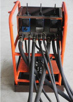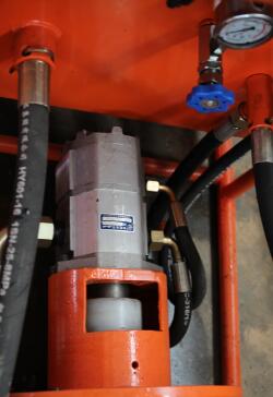 全機(jī)由主機(jī)、操作臺(tái)和泵站三大部分組成,各部分之間用高壓膠管連接全機(jī)由主機(jī)、操作臺(tái)和泵站三大部分組成,各部分之間用高壓膠管連接。而泵站主要有隔爆型電動(dòng)機(jī)、雙聯(lián)齒輪泵、溢流閥、壓力表和油箱組成。電動(dòng)機(jī)啟動(dòng),液壓油從油箱經(jīng)濾油器進(jìn)入雙聯(lián)齒輪泵;齒輪泵輸出主泵和付泵兩聯(lián)高壓油,分別進(jìn)入控制操作臺(tái),主泵供給液壓擺線馬達(dá)、付泵供給推進(jìn)油缸和頂緊油缸液壓油。